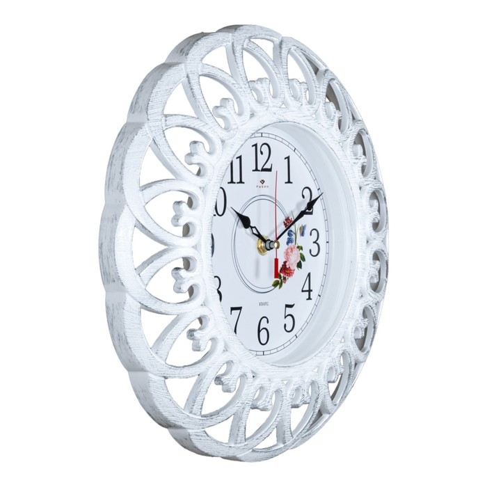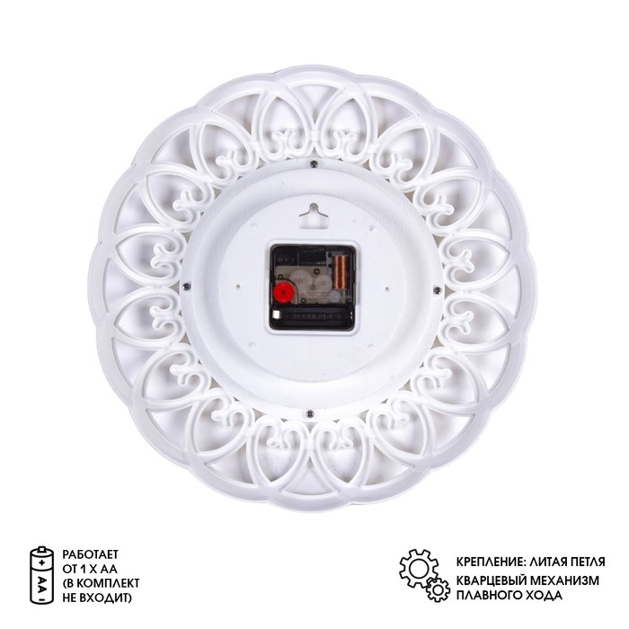 Настенные часы диаметром 30 см. - отличное решение для тех, кто хочет сделать свой интерьер оригинальным и индивидуальным. Винтажный стиль, изысканный ажурный орнамент добавит шарма в любое помещение. Часы работают от одной батарейки АА "пальчиковая", в комплект не входит. Ход часов плавный, бесшумный. Кварцевый механизм гарантирует точность хода и долгосрочную эксплуатацию.