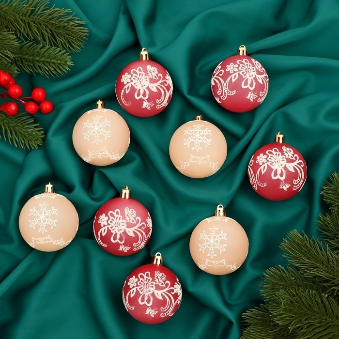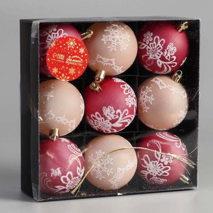 Набор шаров пластик d-5,5 см, 9 шт "Ажур" красный бежевый