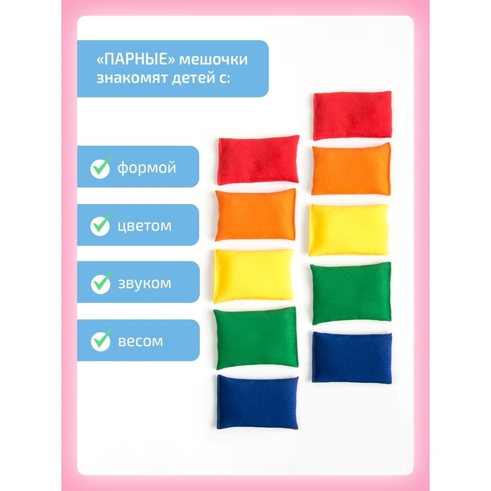 Сенсорные мешочки изготовлены из мягкого габардина и имеют прочные швы. Они прямоугольной формы и представлены в различных цветах, охватывающих всю радугу. Внутри каждого мешочка находится разный наполнитель: горох, фасоль, пшено, ватный шарик, маш, макароны и мелкие камушки.