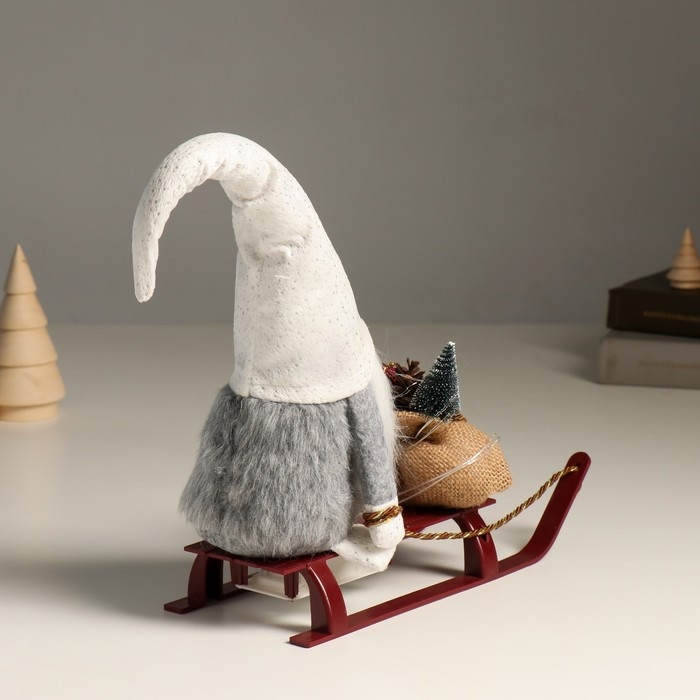 Кукла интерьерная свет "Гном в блестящем колпаке с мешком подарков на санках" 10х26х41 см