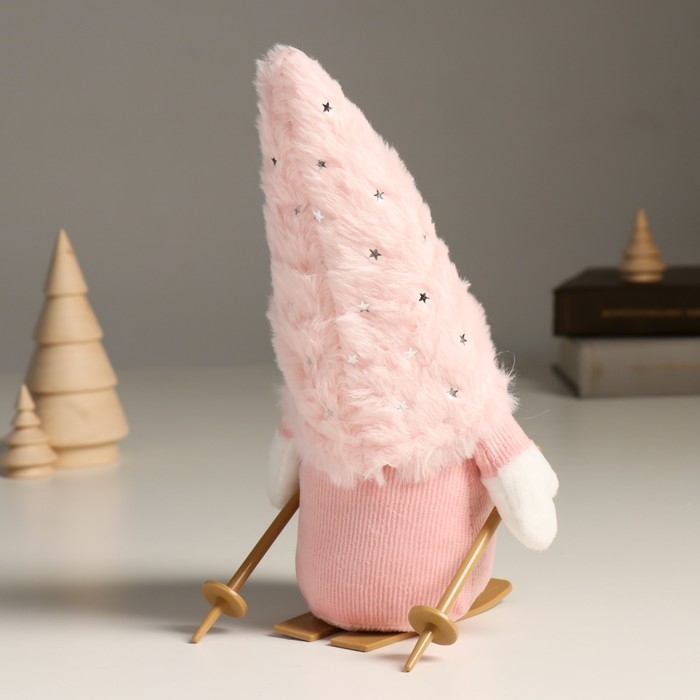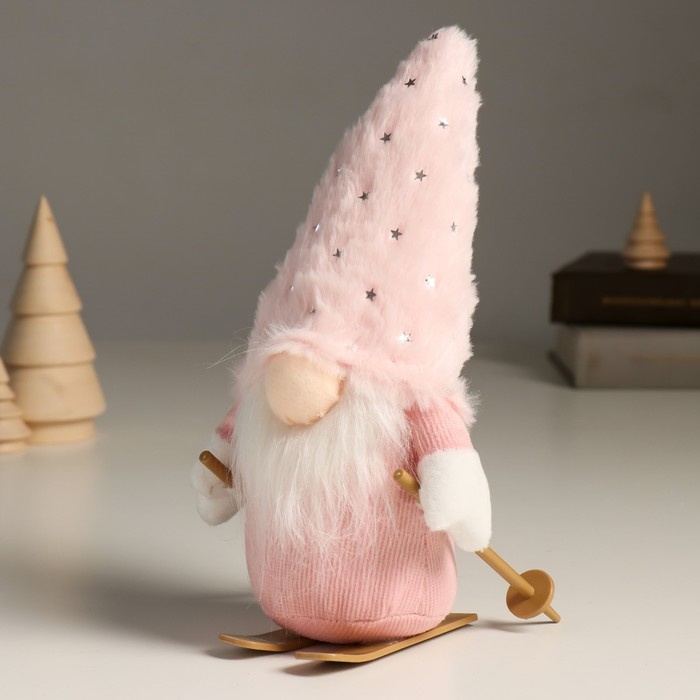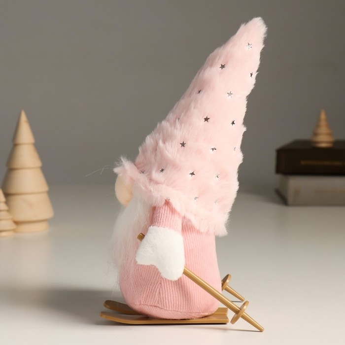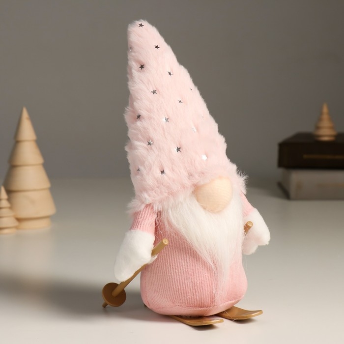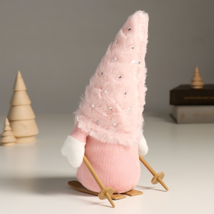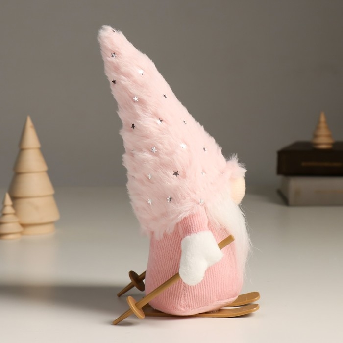 Кукла интерьерная "Гном в розовом с лыжными палками на лыжах" 24 см