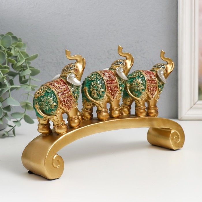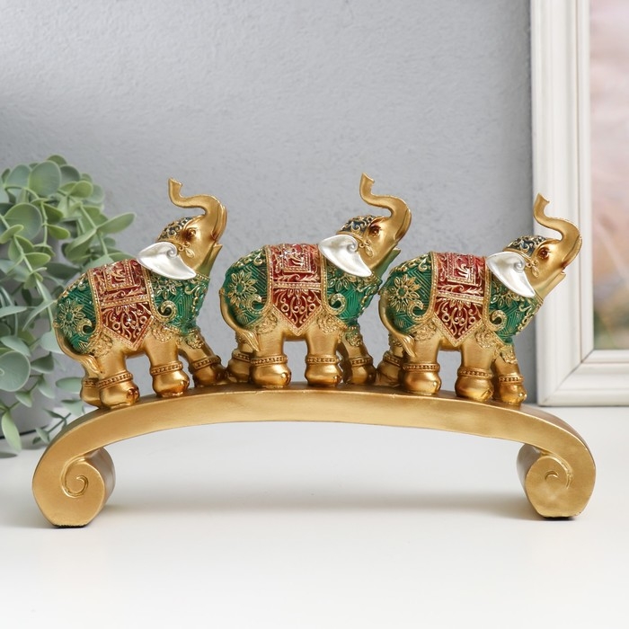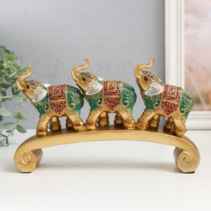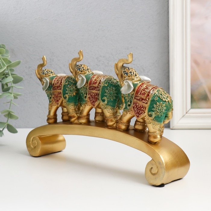 Сувенир полистоун "Три слона на дуге - попона с красно-зелёная" 24х5х15 см
