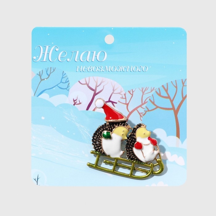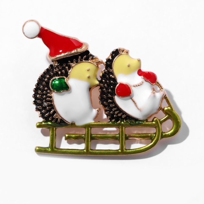 Брошь новогодняя «Ёжики» на санях, цветная в золоте