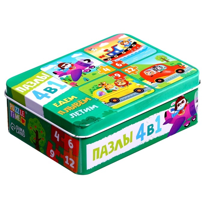 Пазлы 4 в 1 в металлической коробке «Едем, плывём, летим», 4, 6, 9, 12 деталей