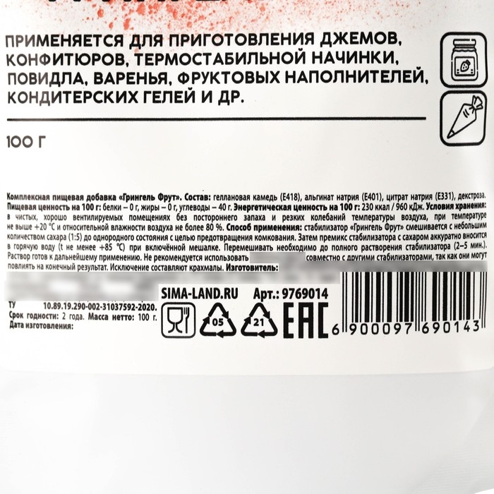 Способ применения: стабилизатор "Грингель фрут" смешивается с небольшим количеством сахара (1:5) до однородного состояния с целью предотвращения комкования. Затем добавить смесь в горячую воду и перемешать.