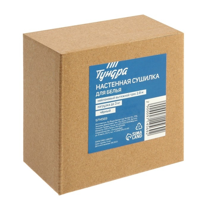 Настенная сушилка для белья ТУНДРА, нейлоновый вытяжной трос 2.8 м. до 3 кг, цвет черный
