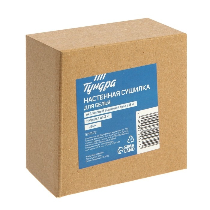 Настенная сушилка для белья ТУНДРА, нейлоновый вытяжной трос 2.8 м. до 3 кг, цвет хром