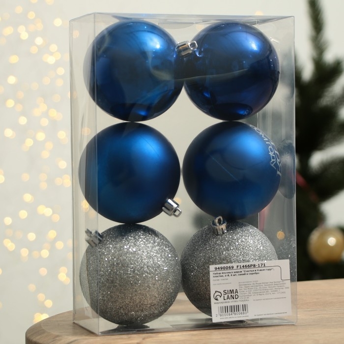 Шары ёлочные новогодние «Счастья в Новом году!», на Новый год, пластик, d=8, 6 шт., цвет синий и серебристый