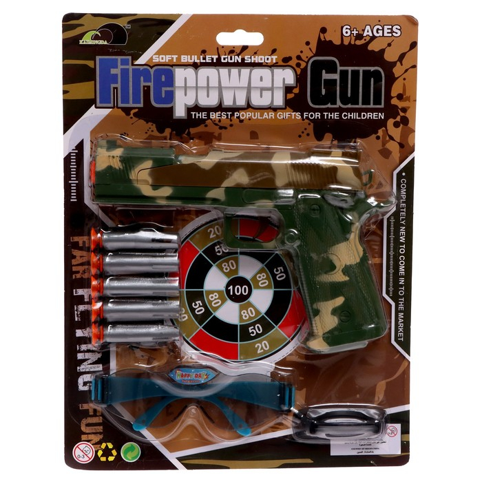 Пистолет «Глок», с мишенью и очками, стреляет присосками