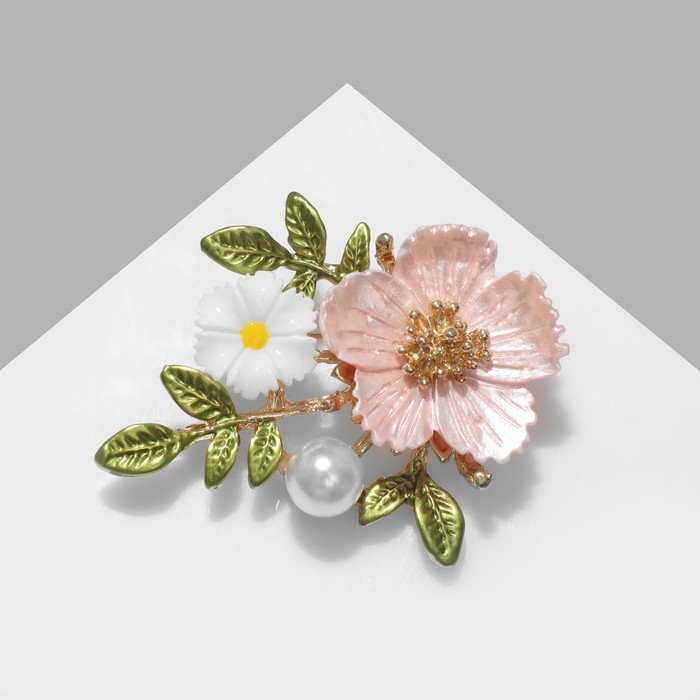 Брошь «Цветы» на ветке, цвет розово-белый в золоте