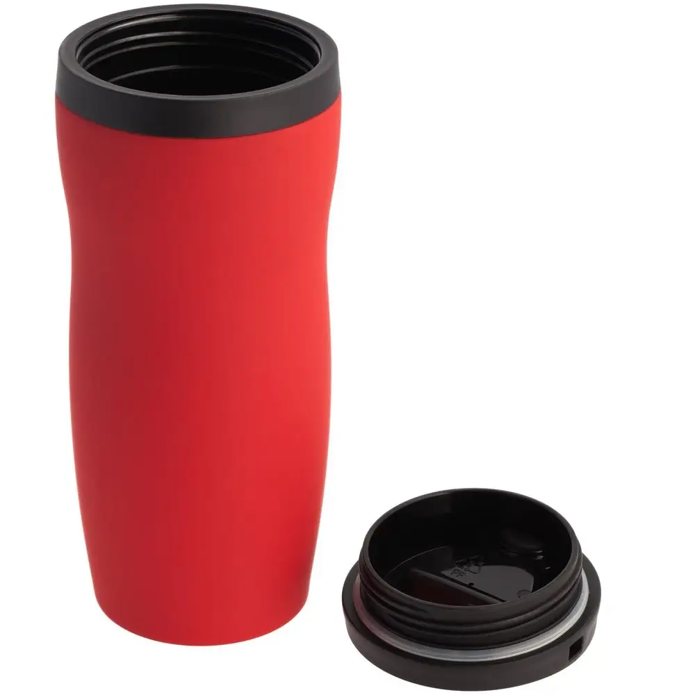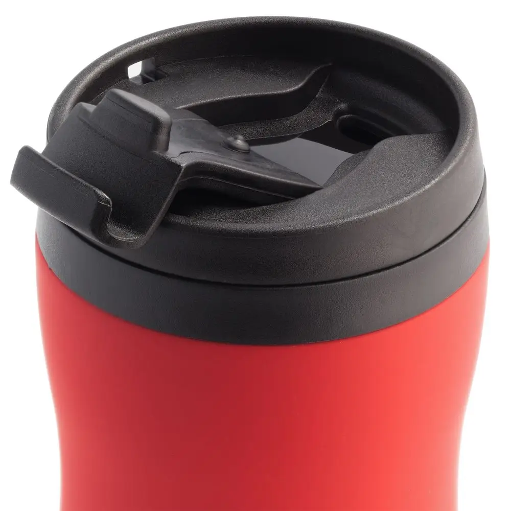 Двухслойная конструкция из нержавеющей стали снаружи и пищевого пластика внутри. Герметичная завинчивающаяся крышка с откидным клапаном для питья. Покрытие софт-тач. В отверстие в крышке можно вставить шнурок для удобного ношения стакана на руке. Шнурок в комплект не входит.