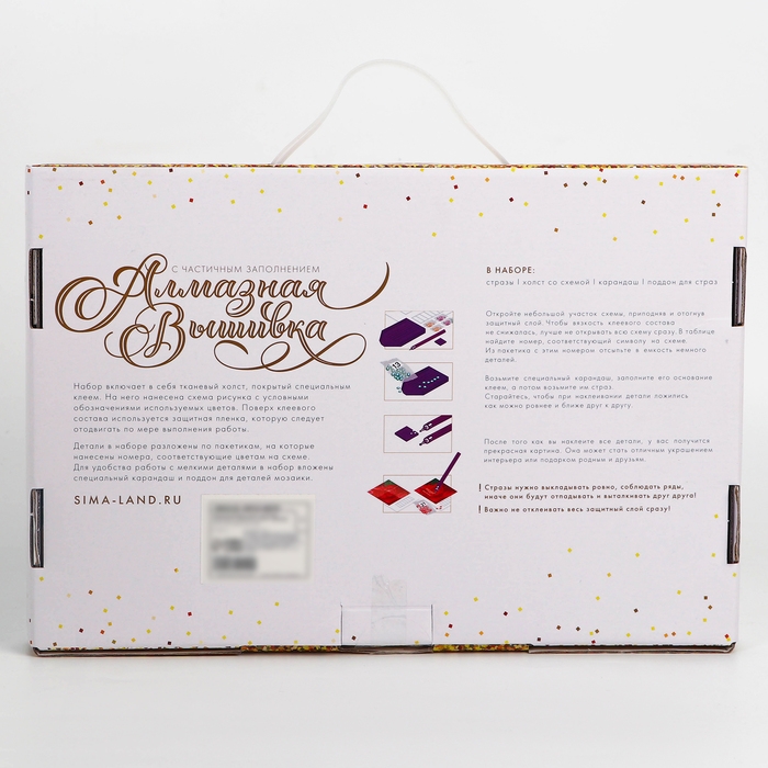 Часть изображения предстоит заполнить стразами, другая часть напечатана на холсте-основе. Поэтому набор подойдёт для тех, кто впервые пробует свои силы в этой технике или любит быстро добиваться результата.