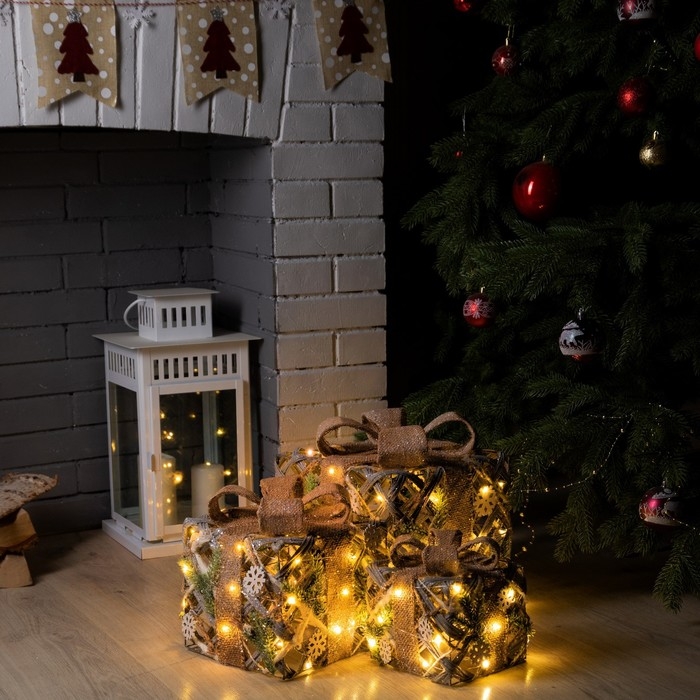 Светодиодная фигура «Подарки с еловой веткой» 15, 20, 25 см, текстиль, металл, батарейки ААх2 (не в комплекте), свечение тёплое белое