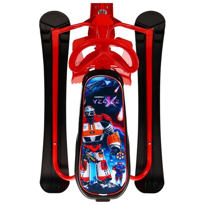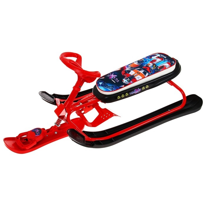 Снегокат предназначен для перевозки детей по плотному снегу или льду, катанию с горок. Имеет сварную конструкцию из стальных труб, пластиковых элементов и мягкое сиденье, обтянутое искусственной кожей с рисунком. Оснащён буксировочным тросом с автоматической намоткой и системой амортизации, которая обеспечивает комфортную поездку по крутым горкам и неровным поверхностям. Усиленный тормоз эффективен на обледенелой поверхности.
