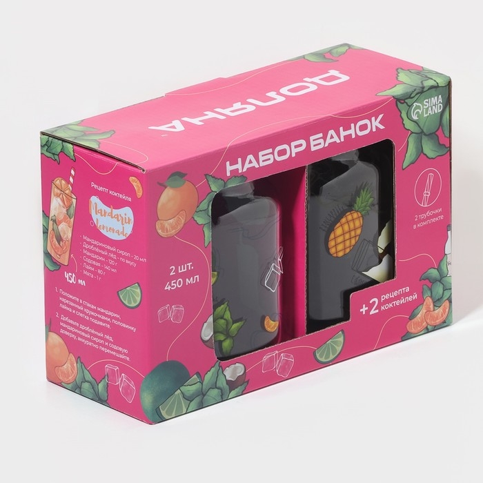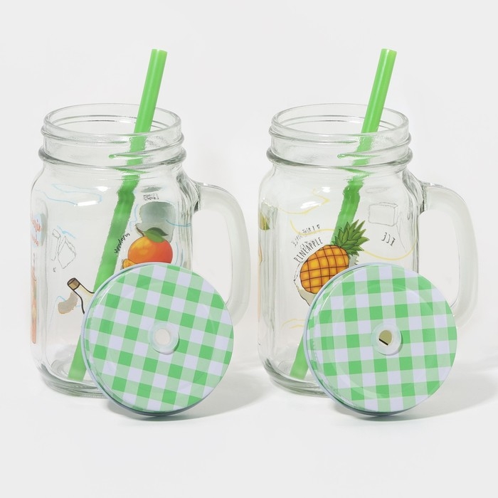 Набор кружек стеклянных Доляна «Летняя прохлада», 2 предмета: 2 кружки с крышками и трубочками 450 мл