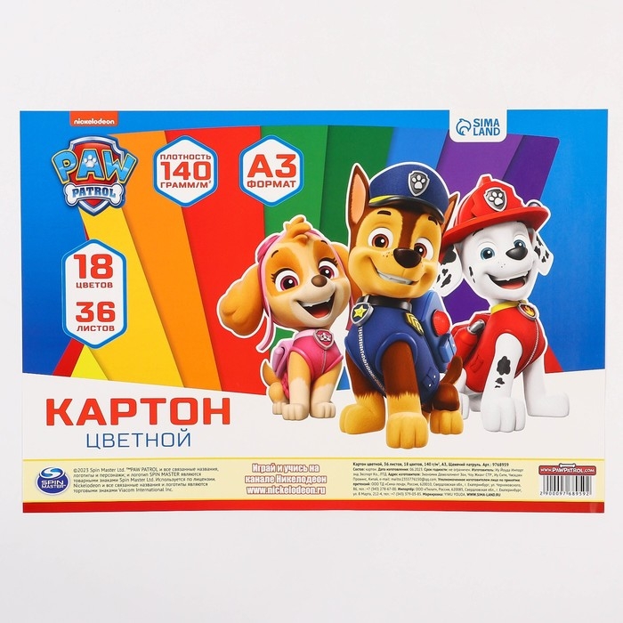 Картон цветной тонированный, А3, 36 листов, 18 цветов, немелованный, двусторонний, в пакете, 140 г/м², Щенячий патруль