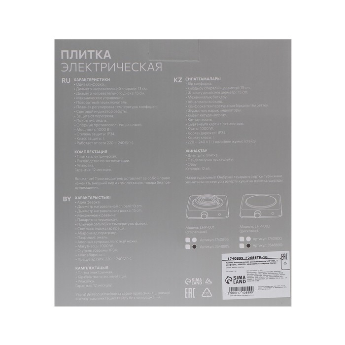 Плитка электрическая Luazon LHP-001, 1 конфорка, 1000 Вт, нагреватель спираль, белая