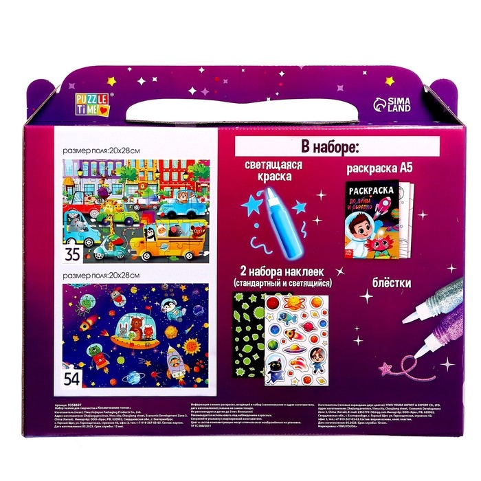 - Ребёнок соберёт 2 пазла с разным количеством деталей и украсит их декором из набора.