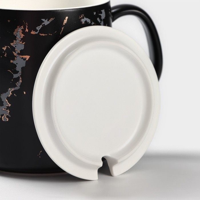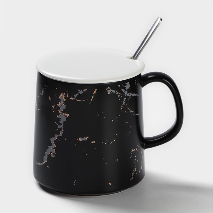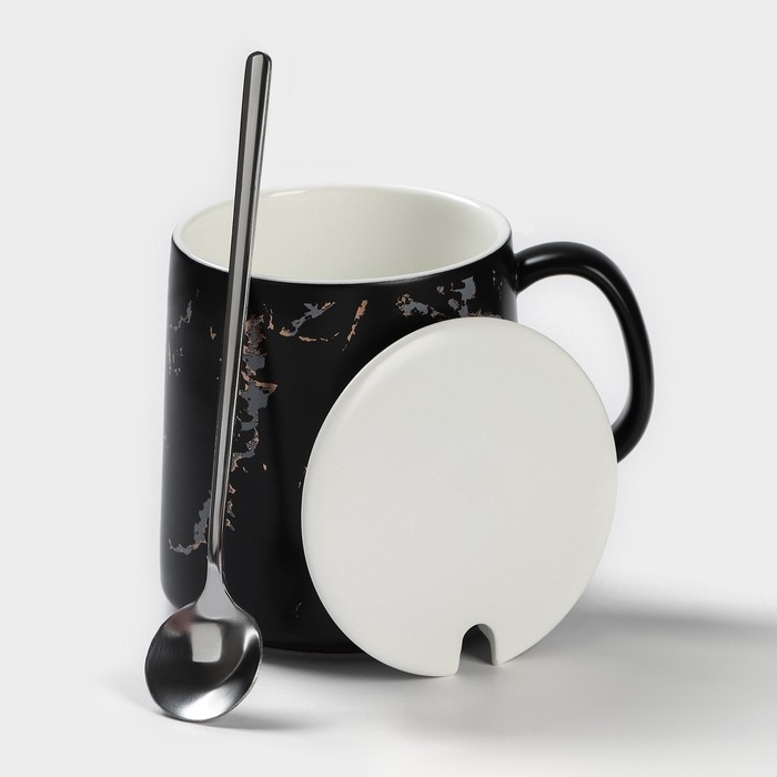 Кружка керамическая с ложкой «Чёрный мрамор», 350 мл, цвет чёрный