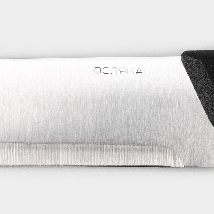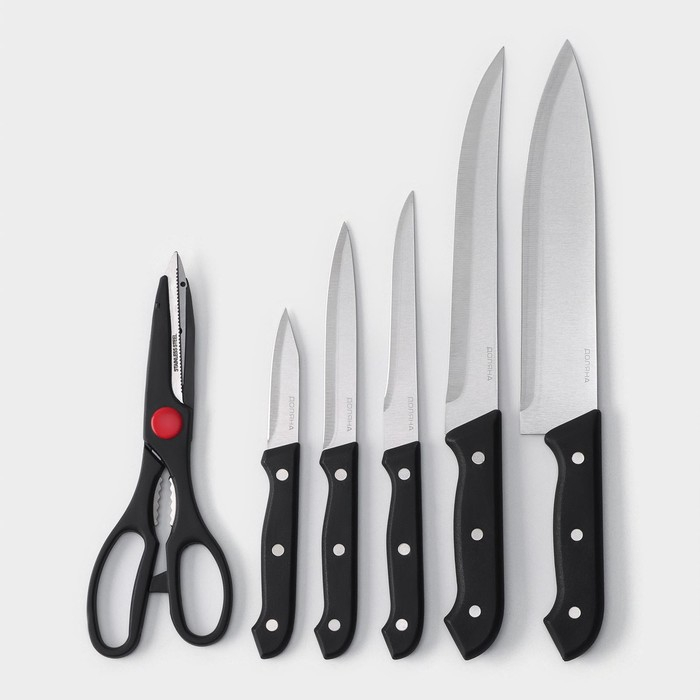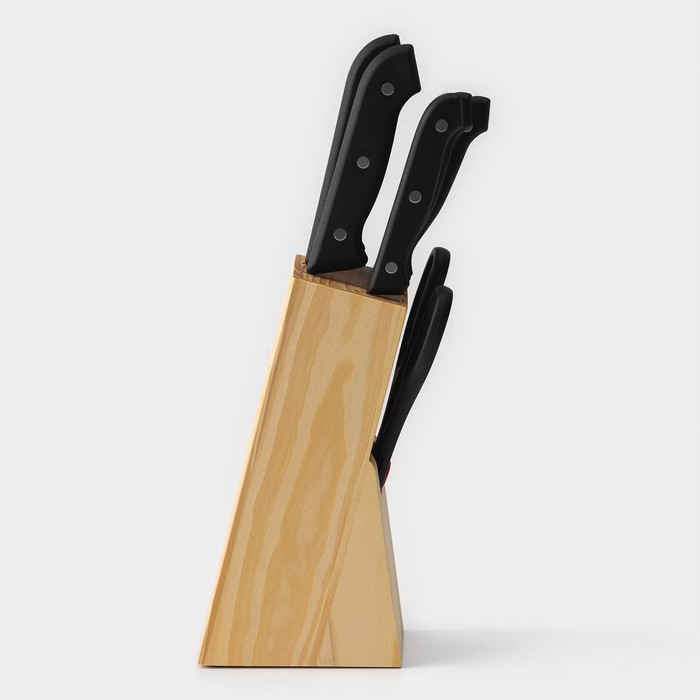 Набор ножей кухонных на подставке Доляна, 6 предметов: ножи 8 см, 11 см, 13 см, 19 см, 20 см, ножницы, цвет чёрный