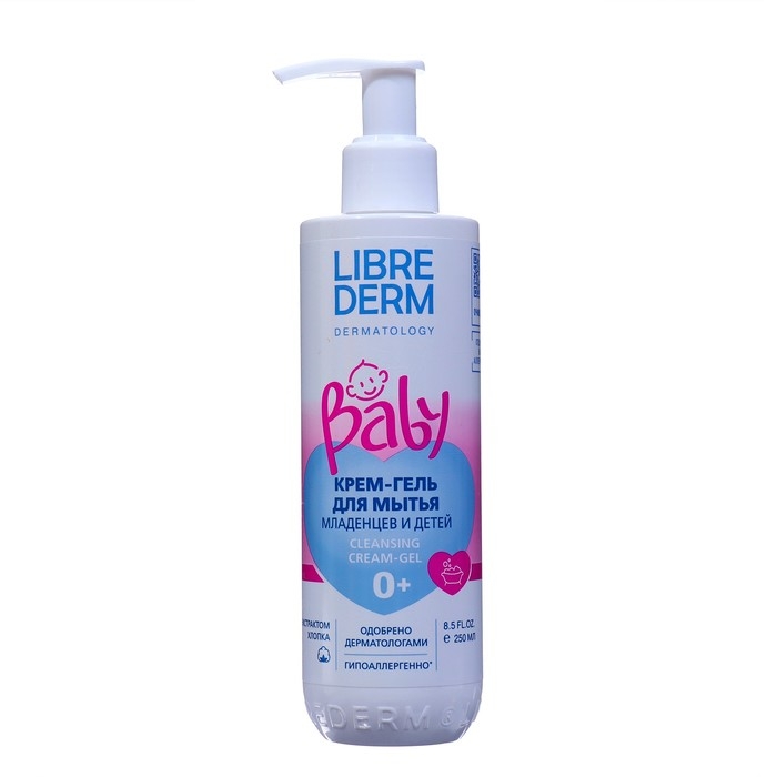 LIBREDERM Baby крем-гель для мытья новорожденных, младенцев и детей 250 мл. Крем-гель предназначен для бережного очищения нежной детской кожи. Мягко воздействует на верхние слои кожи малыша, не вызывает сухости. Экстракт хлопка обладает смягчающими и успокаивающими свойствами, увлажняет кожу малыша. Гель алоэ вера способствует предотвращению раздражения кожи во время ее очищения. Протеины пшеницы делают кожу более мягкой, способствуют сохранению целостности гидролипидного барьера. Пантенол восстанавливает и увлажняет кожу во время мытья.