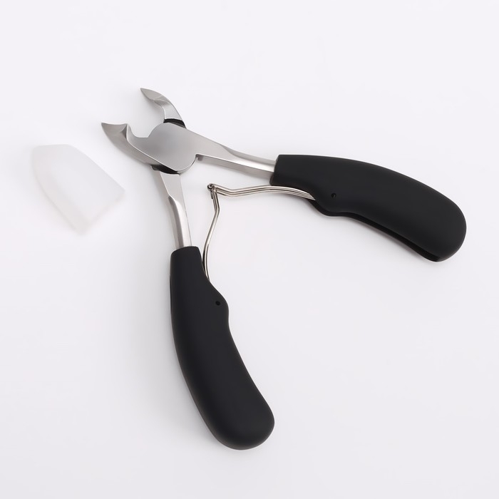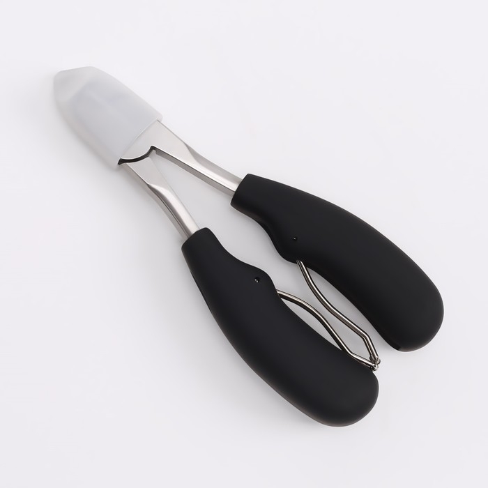 Кусачки педикюрные, с колпачком, с прорезиненными ручками, изогнутое лезвие, 12,5 см, длина лезвия - 15 мм, цвет чёрный/серебристый