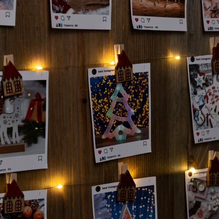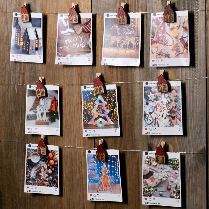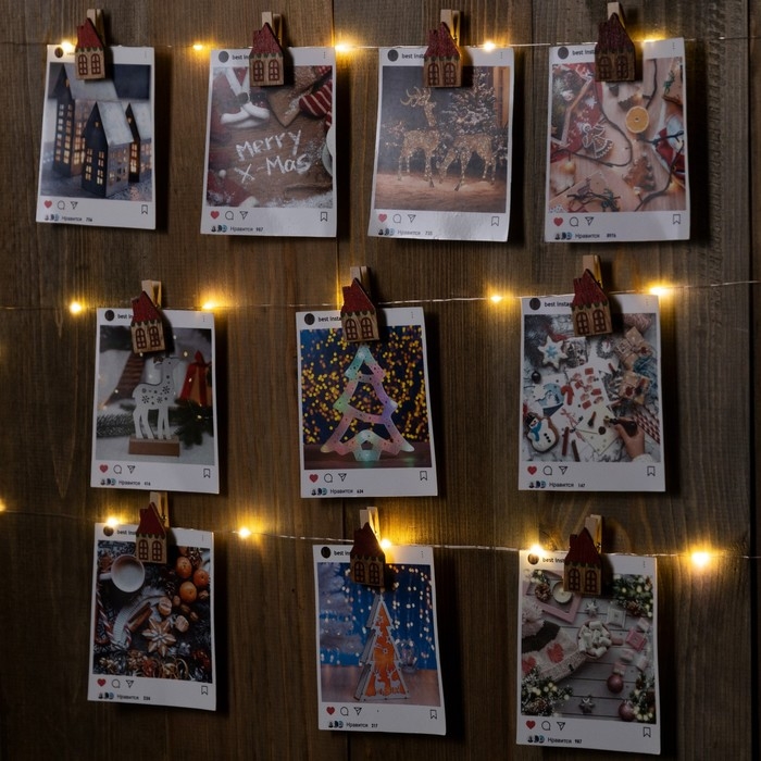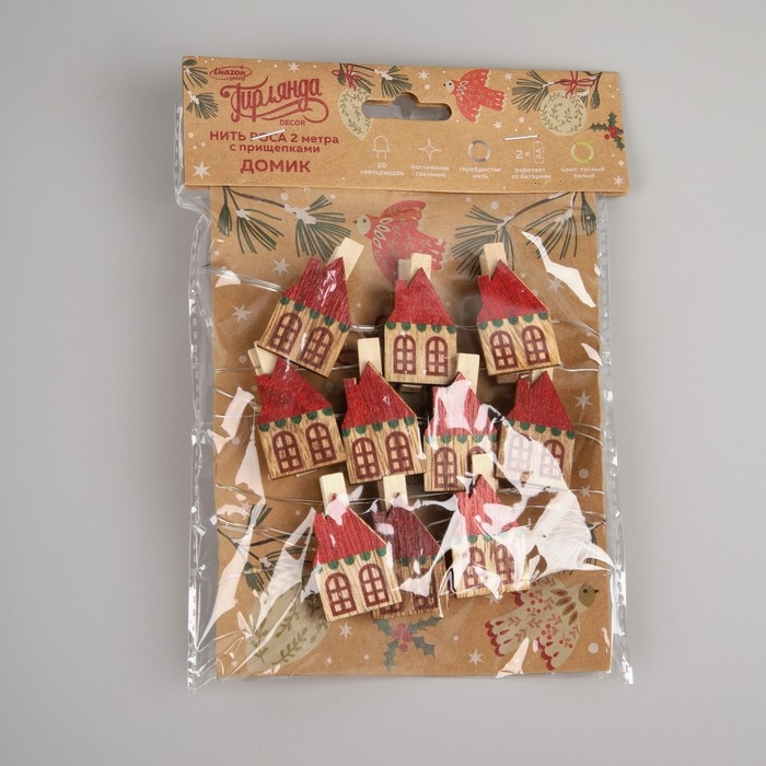 Гирлянда «Нить» 2 м роса с насадками «Прищепки-домики», IP20, серебристая нить, 20 LED, батарейки ААх2 (не в комплекте), свечение тёплое белое