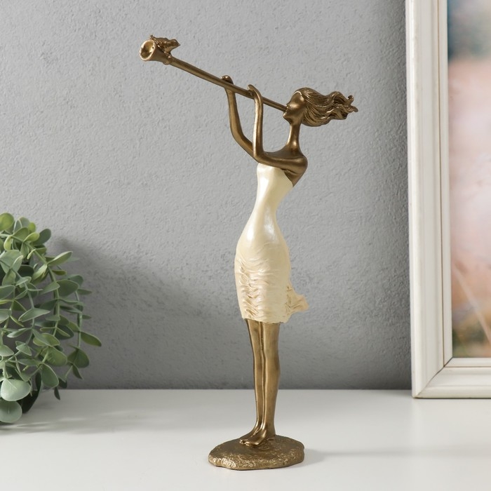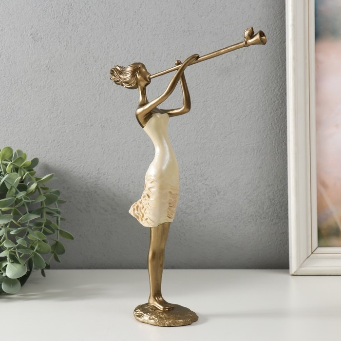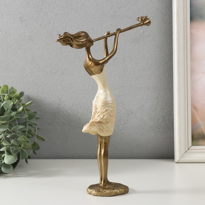 Сувенир полистоун "Девушка играет на дудке, с птичкой" песочная с бронзой 19х6,5х27,5 см