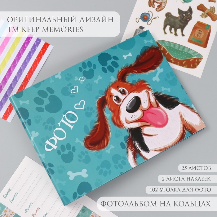 Фотоальбом 25 листов (наклейки+кольца) "Жизнерадостный пёс" 19х27х3 см