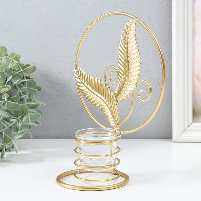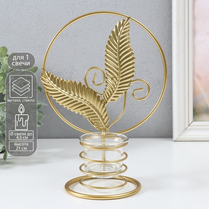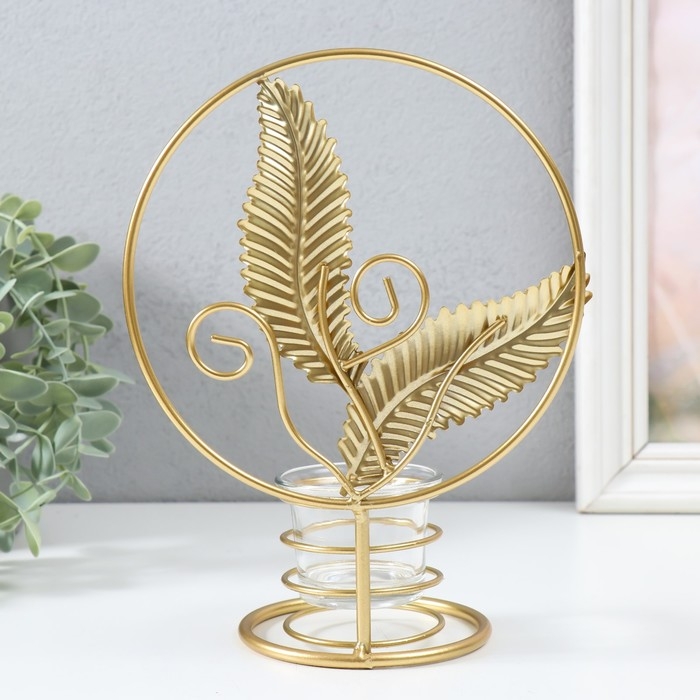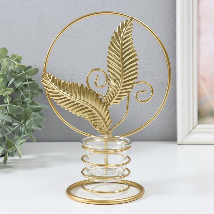 Подсвечник металл на 1 свечу "Золотые листья в круге" d=4,5 см золото 16х9,5х21 см