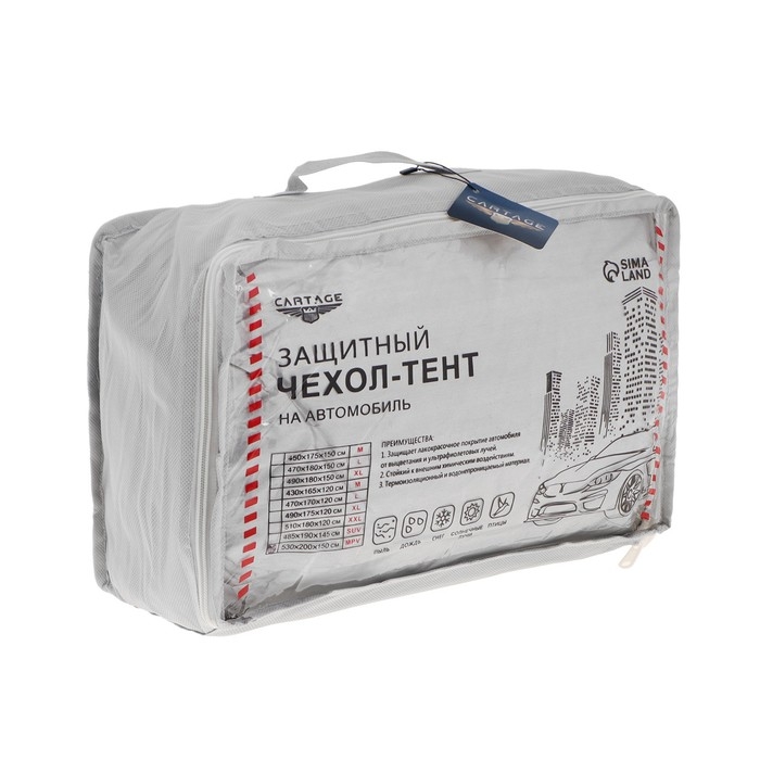 Резинка, расположенная по нижнему краю тента, обеспечивает плотное прилегание и защиту от пыли и грязи. Тент легко устанавливается и снимается, а также имеет стильный дизайн, который прекрасно сочетается с любым автомобилем. CARTAGE Standard обеспечивает надежную защиту от солнца, ветра, дождя и снега. Он также поможет сохранить лакокрасочное покрытие автомобиля в хорошем состоянии и предотвратить его повреждение от ультрафиолетовых лучей и других атмосферных воздействий.