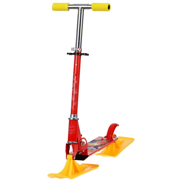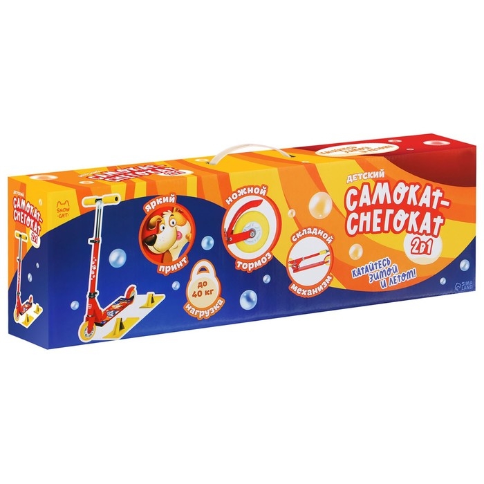 Детский самокат-снегокат предназначен для летнего и зимнего активного отдыха. Конструкция представляет собой раму самоката, на которую можно установить лыжи или колёса. Передняя лыжа/колесо управляется поворотом руля. На колёсах можно кататься по любым ровным поверхностям в сухое время года, на лыжах — по снегу.