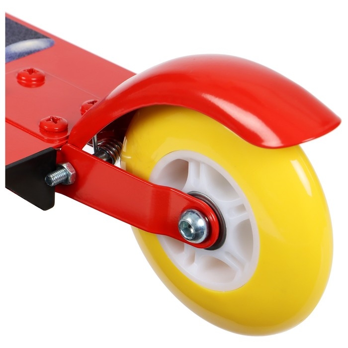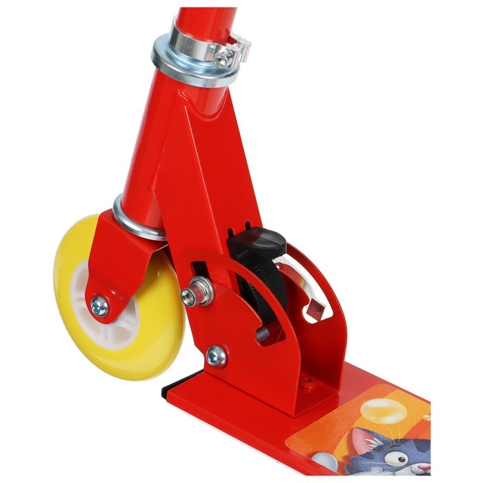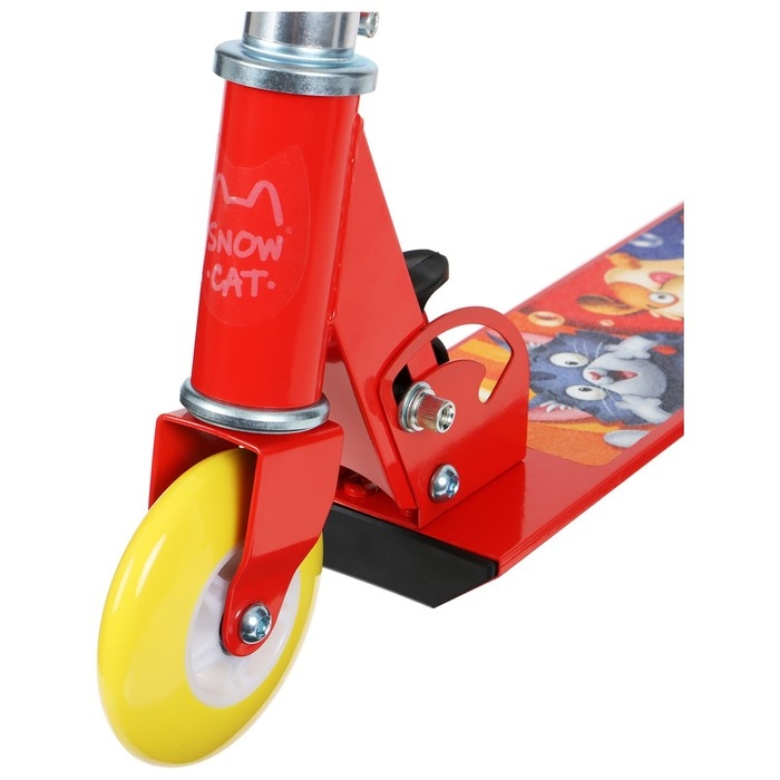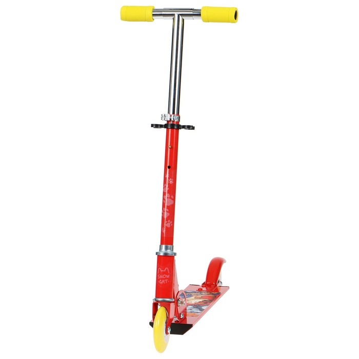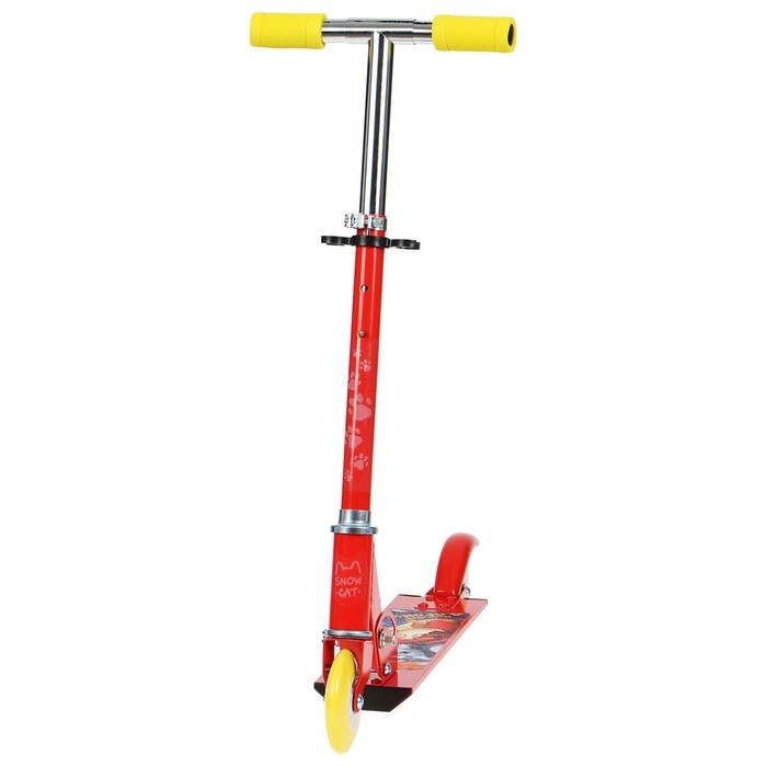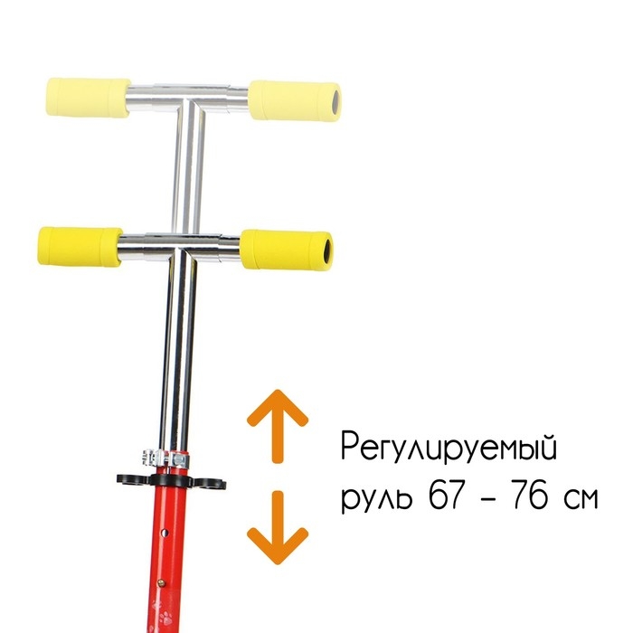 Платформа с шероховатым покрытием предотвращает скольжение ног. Высота руля регулируется и фиксируется в трёх положениях. Рама складывается: рулевая стойка опускается к деке. В таком положении самокат занимает мало места.