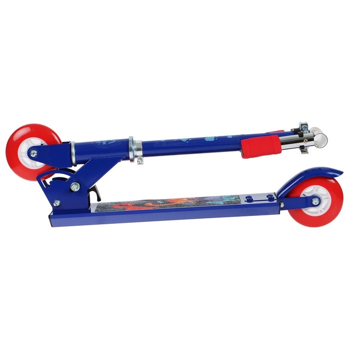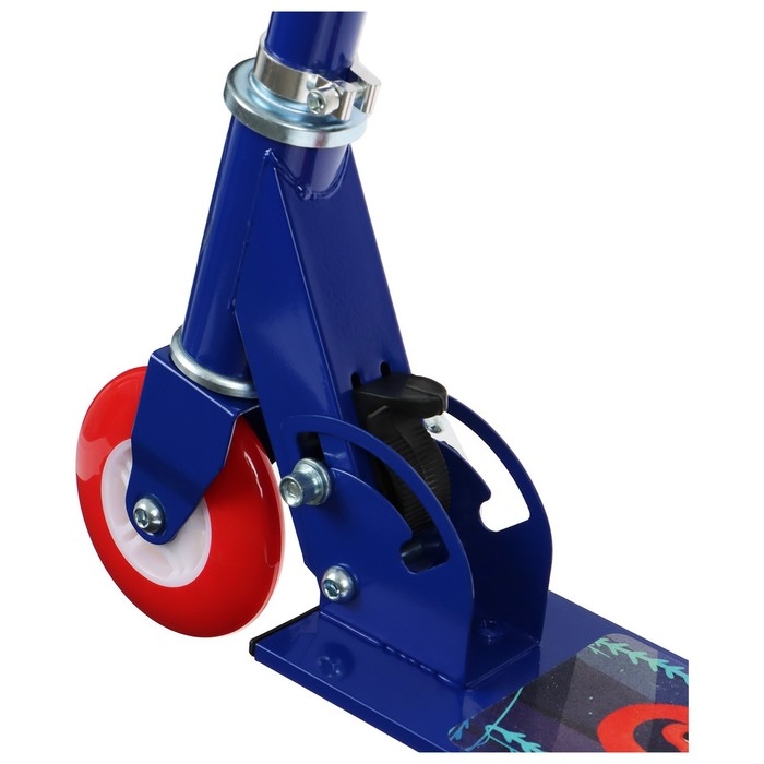 Платформа с шероховатым покрытием предотвращает скольжение ног. Высота руля регулируется и фиксируется в трёх положениях. Рама складывается: рулевая стойка опускается к деке. В таком положении самокат занимает мало места.