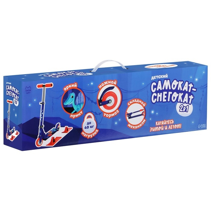 Детский самокат-снегокат предназначен для летнего и зимнего активного отдыха. Конструкция представляет собой раму самоката, на которую можно установить лыжи или колёса. Передняя лыжа/колесо управляется поворотом руля. На колёсах можно кататься по любым ровным поверхностям в сухое время года, на лыжах — по снегу.