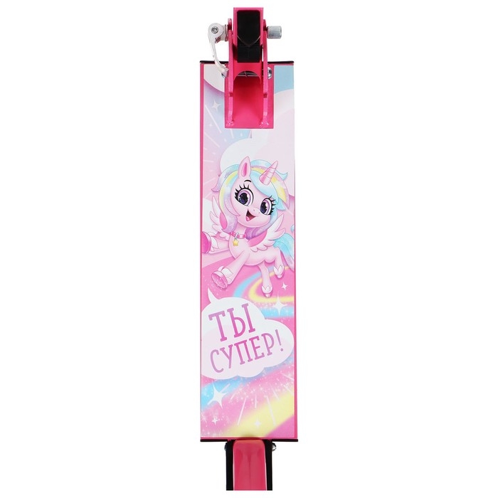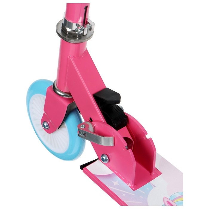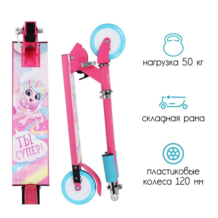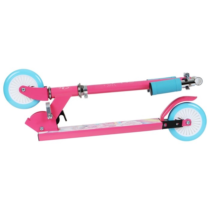 Рама складывается: рулевая стойка опускается к деке. В таком состоянии самокат занимает мало места. Платформа с шероховатым покрытием предотвращает скольжение ног. Высота руля регулируется и фиксируется в трёх положениях.