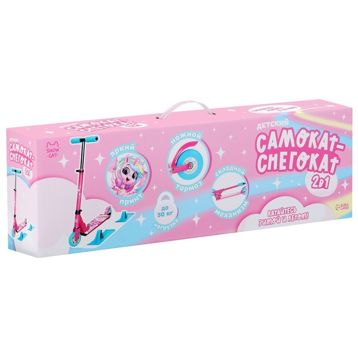 Детский самокат-снегокат — новая модель для летнего и зимнего активного отдыха. Конструкция представляет собой раму самоката, на которую установлены лыжи. Передняя лыжа управляется поворотом руля. Колёса можно установить в любой момент, для этого в комплекте есть всё необходимое.