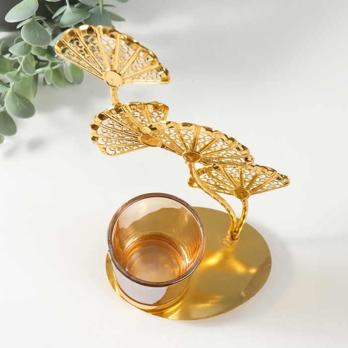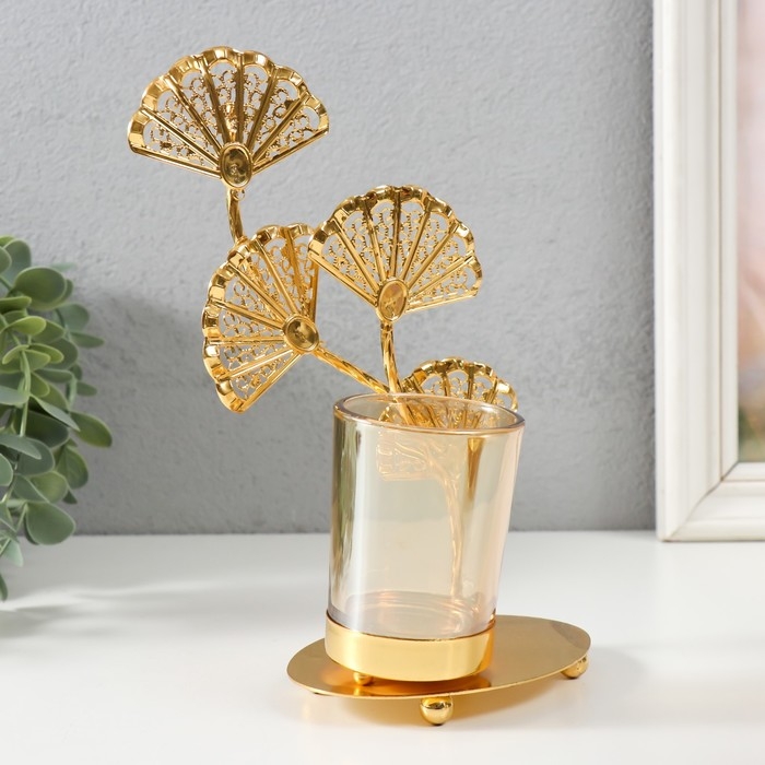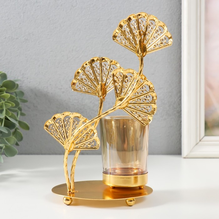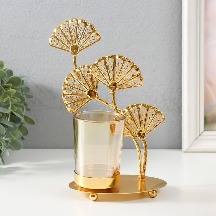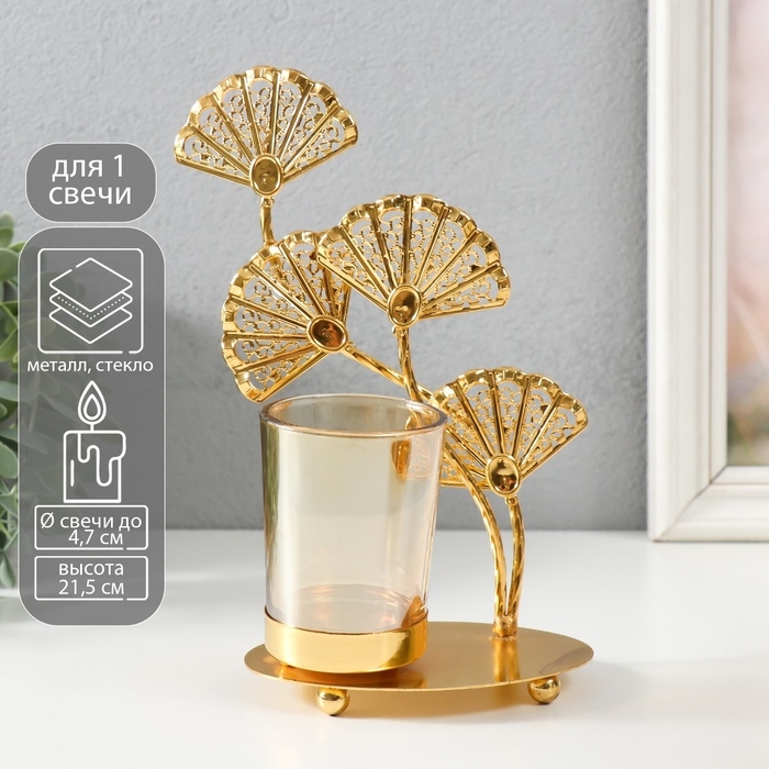 Подсвечник металл, стекло на 1 свечу "Цветы-веера" d=4,7 см, золото 16,7х8х21,5 см