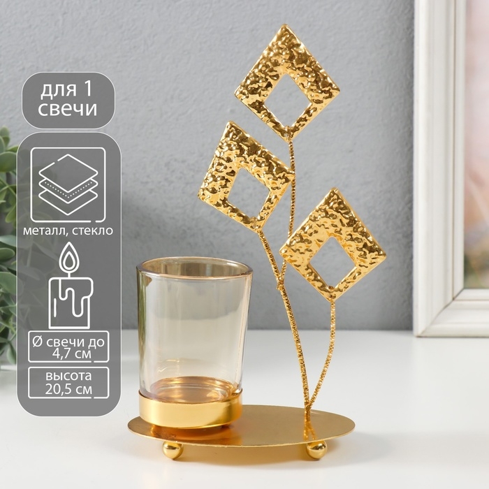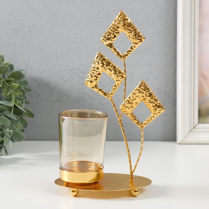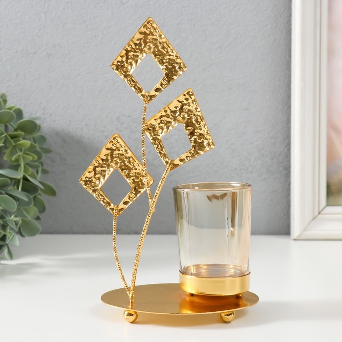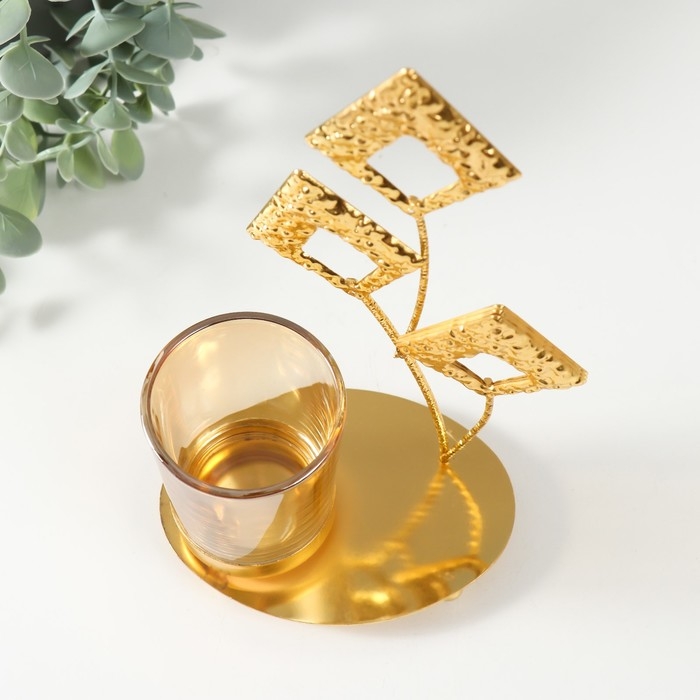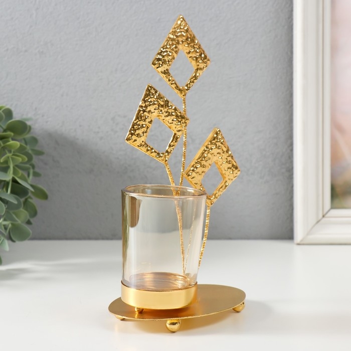 Подсвечник металл, стекло на 1 свечу "Листья-ромбики" d=4,7 см, золото 13х8х20,5 см