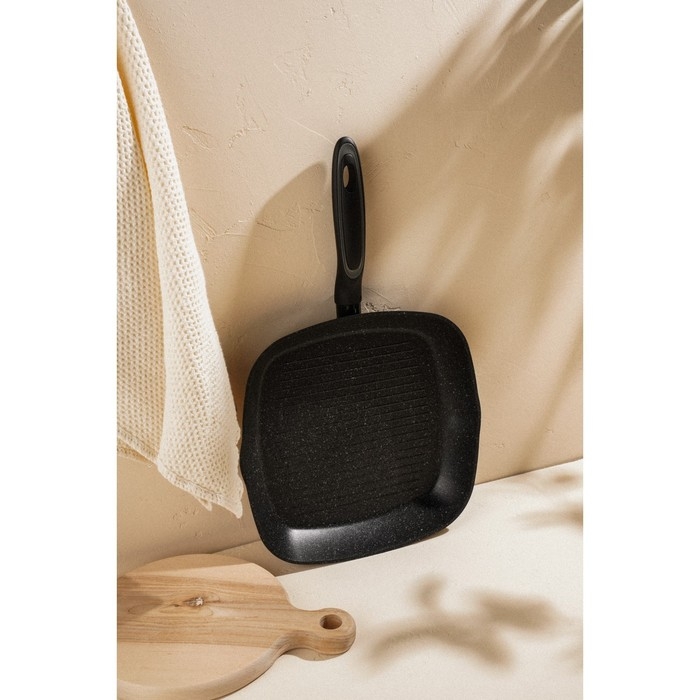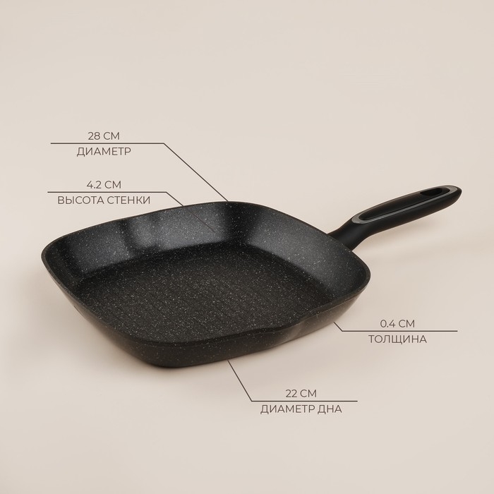 - Идеальная форма и размеры: квадратная форма диаметром 28 см и высотой стенок 4,2 см обеспечивает равномерное распределение тепла и идеально подходит для приготовления стейков, овощей и других блюд.