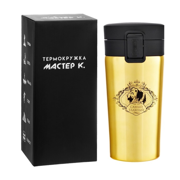 Термокружка для кофе и чая "Мастер К" идеальна для офиса, автомобиля, длительных прогулок и детям в школу. Благодаря специальному покрытию надежно лежит в руке.