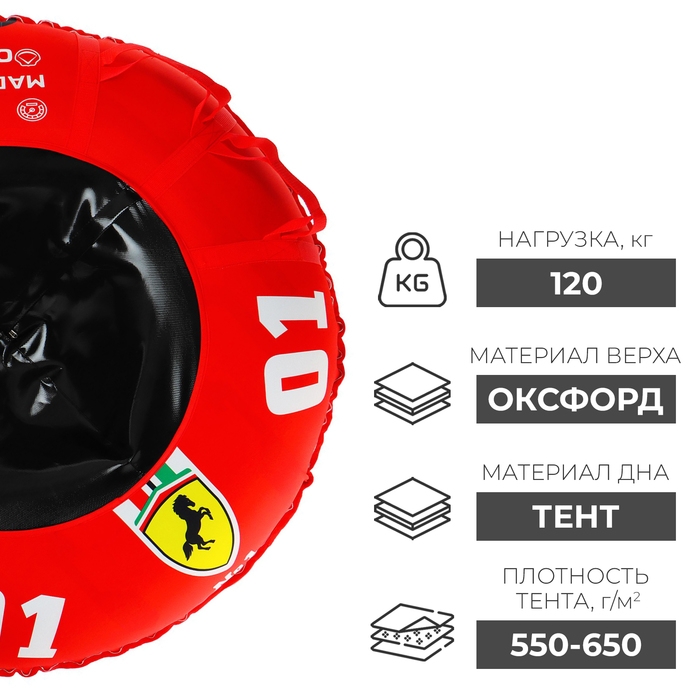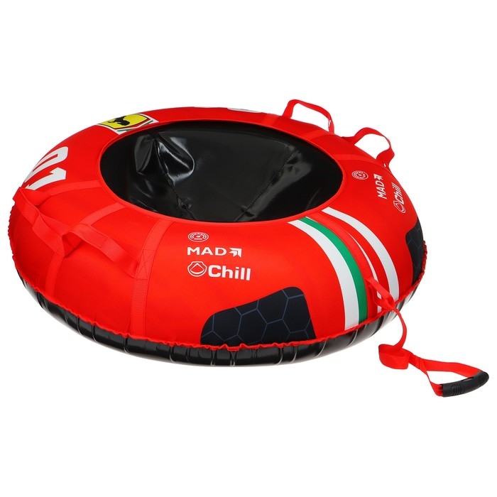 Дно тюбинга изготовлено из тентовой ткани плотностью 550–650 г/м², что гарантирует долгий срок службы и обеспечивает отличное скольжение. Снаряд оснащён безопасными ручками и молнией для быстрого доступа к камере. Имеет закрытую сердцевину, что исключает попадание снега внутрь. Для тюбинга подойдёт камера 15 дюймов. Предназначен для детей от 12 лет.