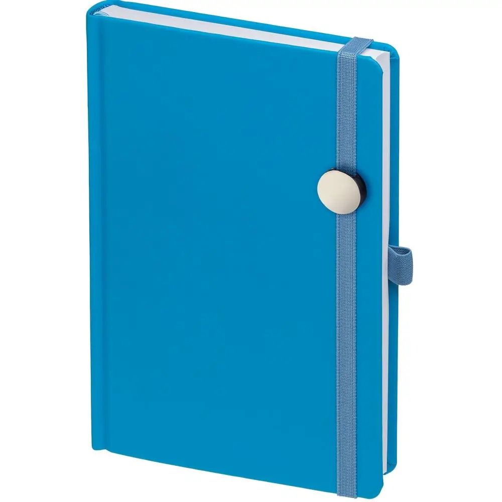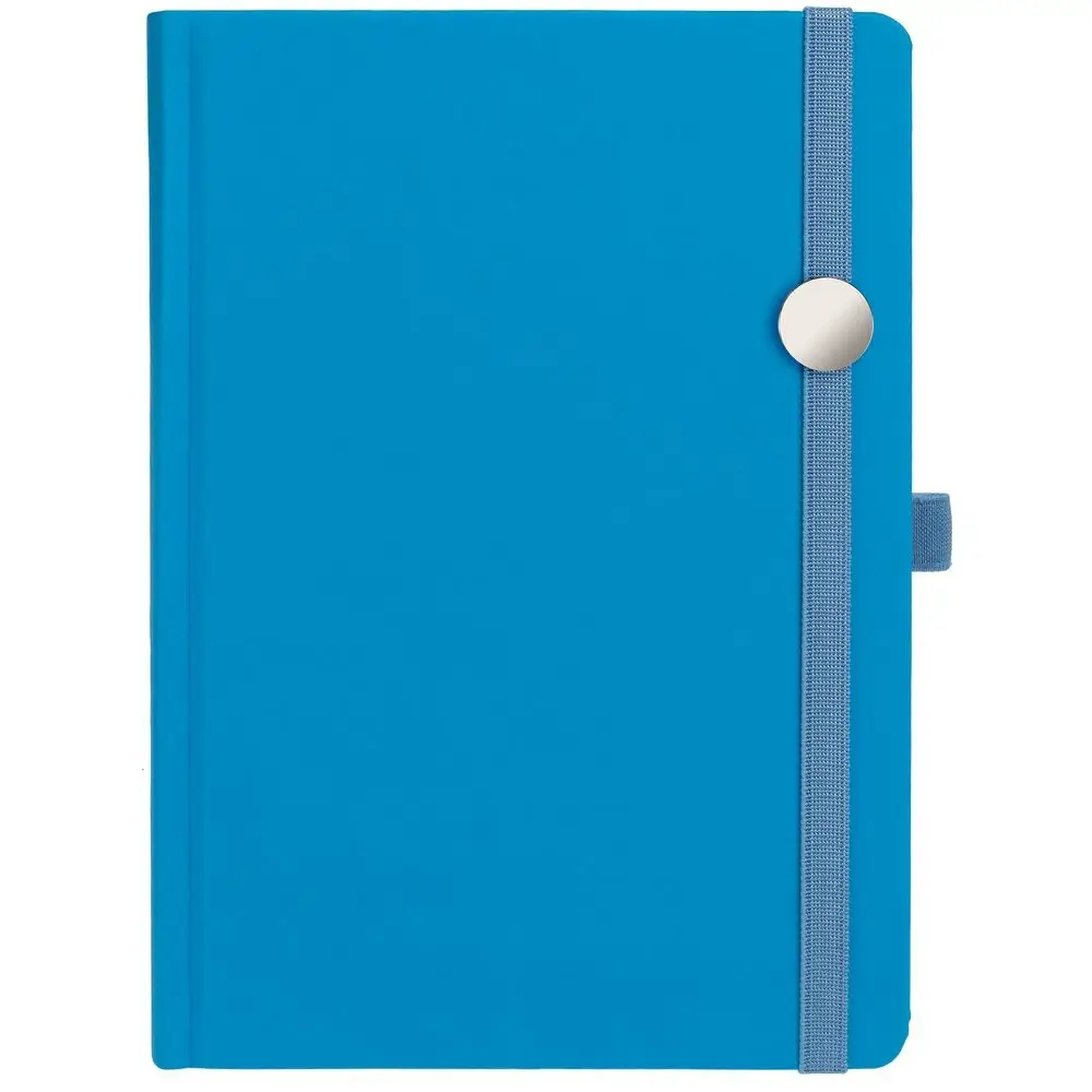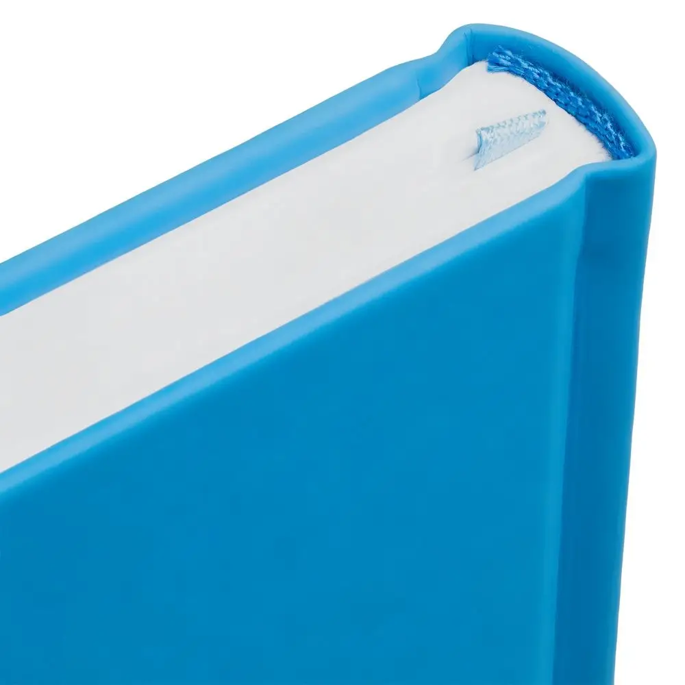 Ежедневник с твердой обложкой без поролона, выполнен из материала Soft Touch Ultra, голубой JJ, дополнен резинкой шириной 1 см, петлей-резинкой для ручки, капталом и ляссе голубого цвета.