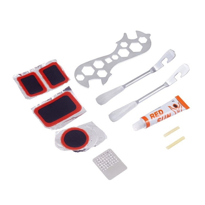 Набор для велосипеда 3 в 1: ремонтный набор, велосипедный ключ, сумка. Набор инструментов для велосипеда необходим для выполнения различных работ по обслуживанию и ремонту велосипеда. С помощью такого набора вы сможете самостоятельно устранить большинство неисправностей, а также провести профилактический осмотр и настройку своего велосипеда. Например, можно заменить камеру или покрышку, настроить тормозную систему, выполнить ремонт рамы или вилки. В набор входит: черная сумка из оксфорда с элементами из пластика, внутренним отделением и светоотражающими элементами; 1 комбинированный (семейный) ключ выполнен из металла, 2 монтировки (монтажки) для перебортовки колес выполнены из металл, 5 заплаток для шин, 1 клей, 1 наждачка для зачистки, 2 резинки на ниппель, ключ накидной для снятия топкэпа вилок велосипеда, черный фонарик (10 х 6,5 см). Фонарь велосипедный передний, 50 лм, 5 led, 4 ААА, 3 режима. Специально для вашей ночной или вечерней поездки. Универсальность и безопасность - вот главные характеристики данной модели. Вы можете взять его с собой, например, в поход, на рыбалку, или же он вам пригодится во время кемпинга.