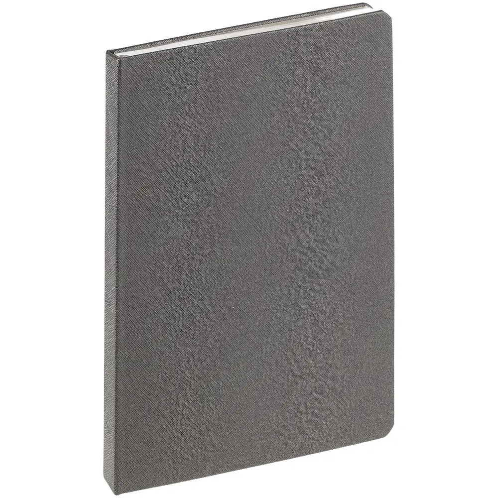Ежедневник с твердой обложкой и серебристым обрезом, выполнен из материала Saffian, темно-серый, дополнен ляссе в цвет обложки.