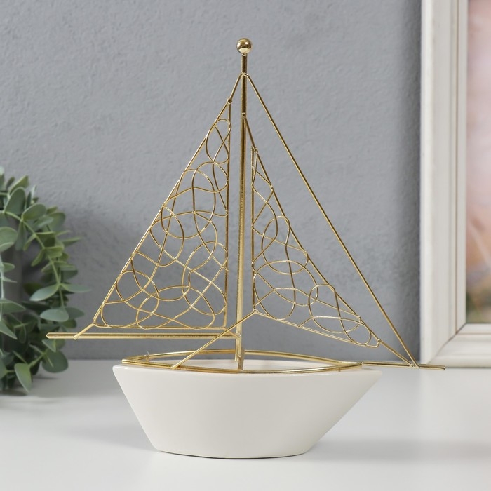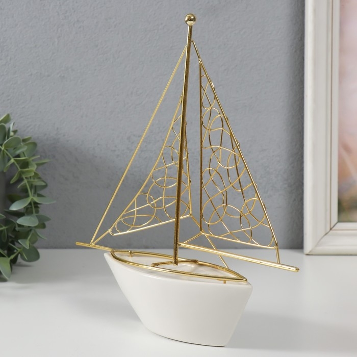 Сувенир керамика, металл "Корабль с парусами" белый с золотом 22,8х5,9х24 см