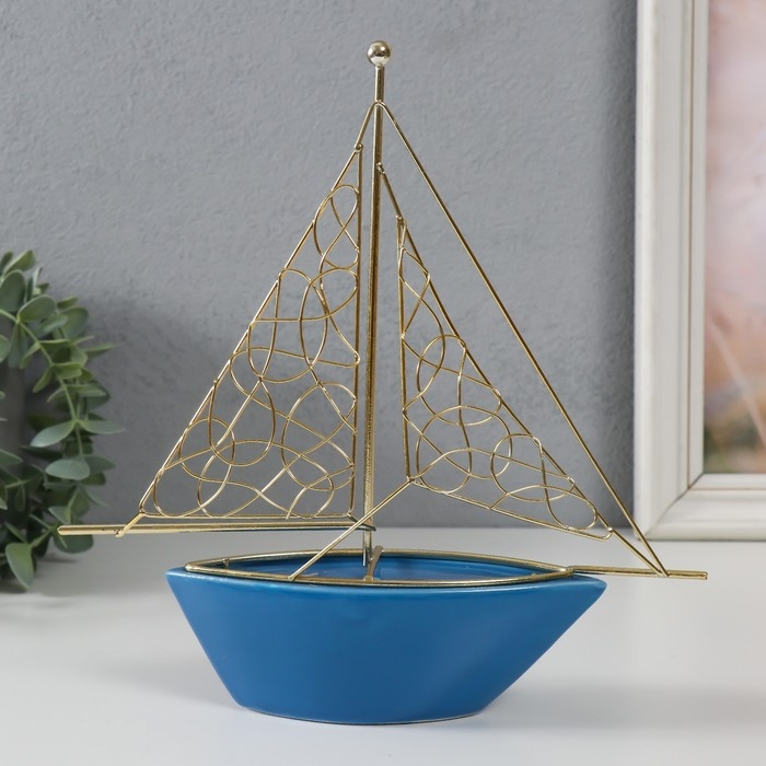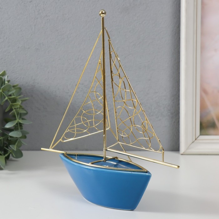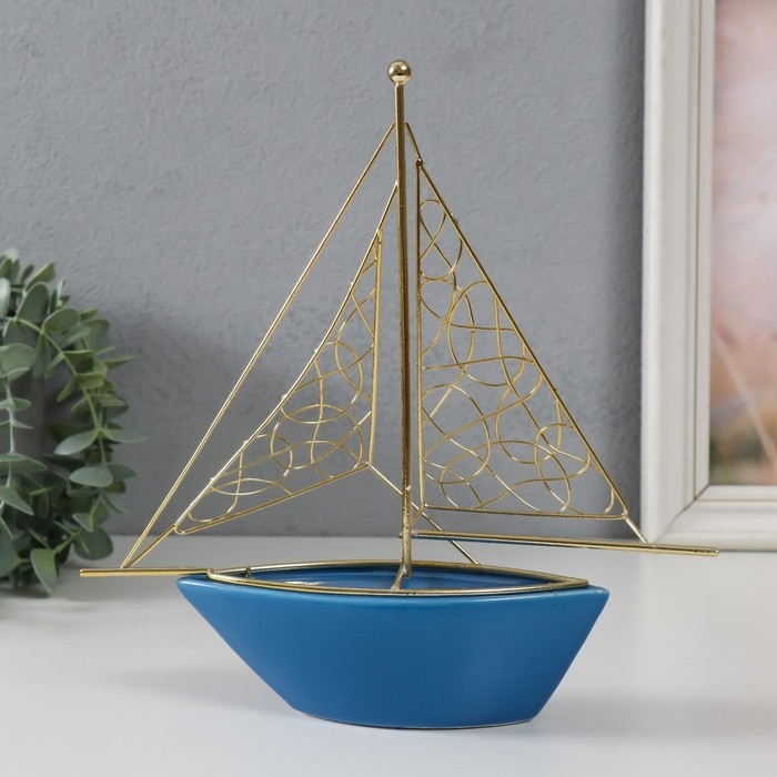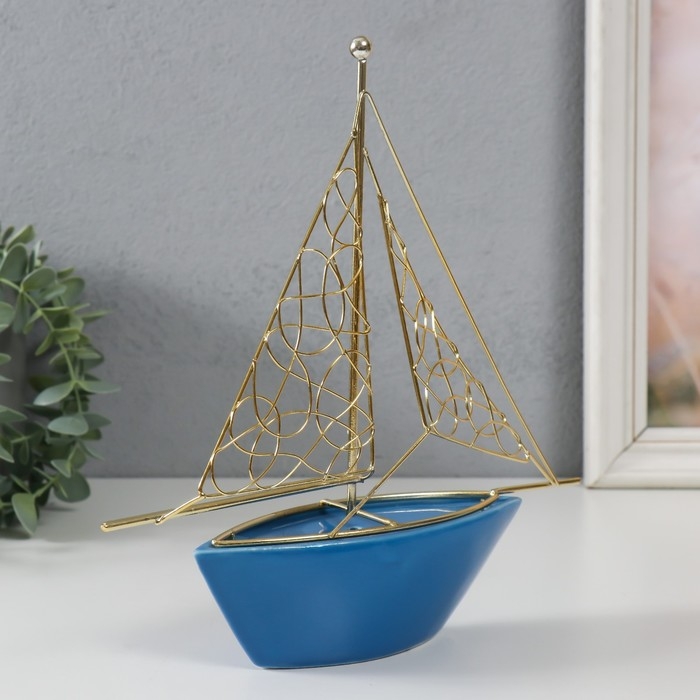 Сувенир керамика, металл "Корабль с парусами" голубой с золотом 22,8х5,9х24 см