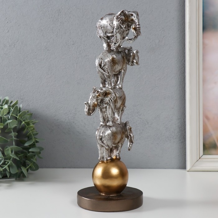 Сувенир полистоун "Четыре слона на шаре - пирамида" серебро 13,1х11,1х31 см