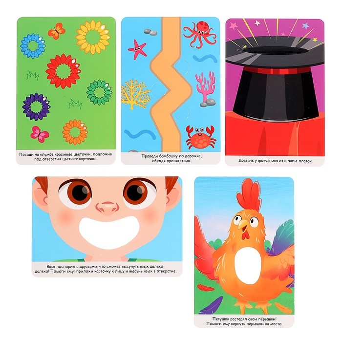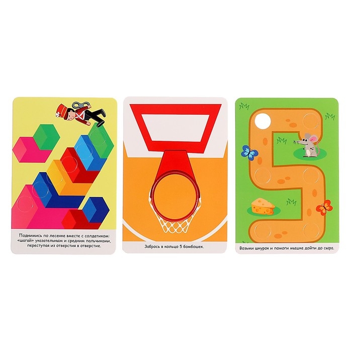 - Пусть ребёнок выберет любую карточку. Прочитайте задание, пусть малыш выполнит его, используя предметы из набора. Например, в задании «Положи платочек в кармашек» нужно протянуть через карточку платочек.