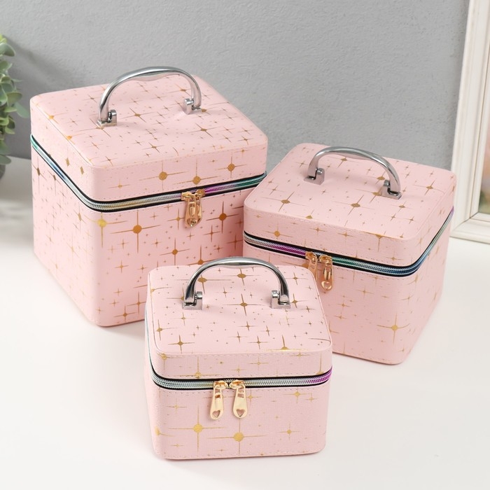 Шкатулка кожзам с зеркалом "Вспышка беж" н-р 3 шт 16,5х16,5х14 15х15х10,5 19х19х19 см